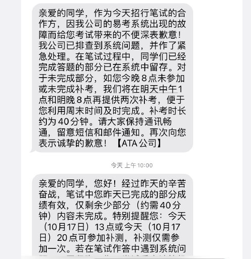 針對考試人員反映的問題,招商銀行筆試合作方、考試組織方ATA發(fā)布信息稱已排查到系統(tǒng)問題,并做了緊急處理??荚囄赐瓿刹糠謱⑦M行補考,補考時長約為35至40分鐘。
