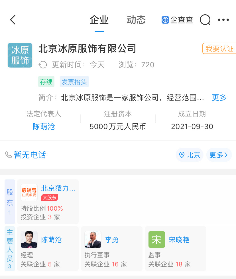 企查查App顯示,今年9月,猿輔導(dǎo)關(guān)聯(lián)公司對外投資成立北京冰原服飾有限公司。陳萌滄為該公司法定代表人,猿輔導(dǎo)創(chuàng)始人李勇為執(zhí)行董事。