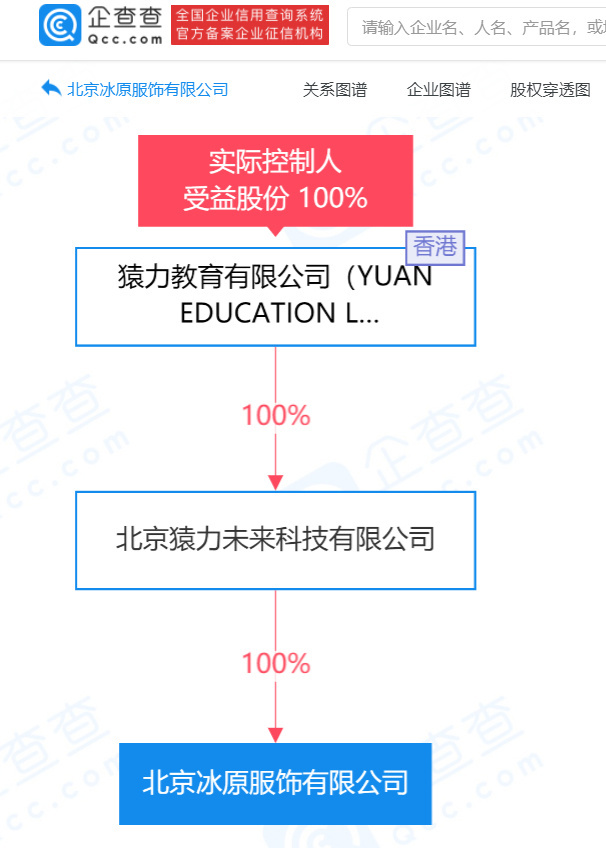 企查查股權(quán)穿透顯示,北京冰原服飾有限公司由北京猿力未來科技有限公司100%控股,而北京猿力未來科技有限公司由猿力教育有限公司100%控股。