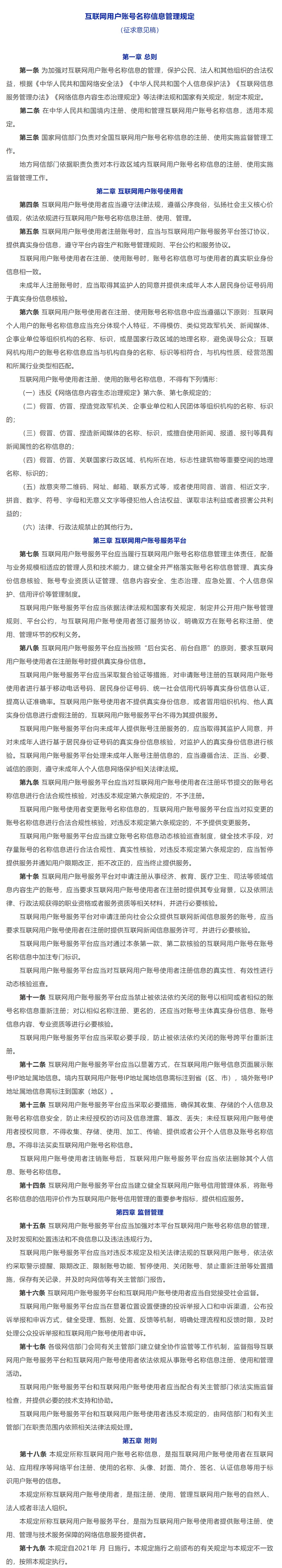 國(guó)家網(wǎng)信辦:《互聯(lián)網(wǎng)用戶賬號(hào)名稱信息管理規(guī)定(征求意見(jiàn)稿)》公開(kāi)征求意見(jiàn)