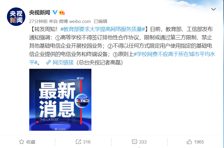 日前,教育部、工信部發(fā)布通知強調(diào):①高等學校不得簽訂排他性合作協(xié)議,限制或通過第三方限制、禁止其他基礎電信企業(yè)開展校園業(yè)務;②不得以任何方式限定用戶使用指定的基礎電信企業(yè)提供的電信業(yè)務和終端設備;③原則上學校網(wǎng)費不應高于所在城市平均水平。