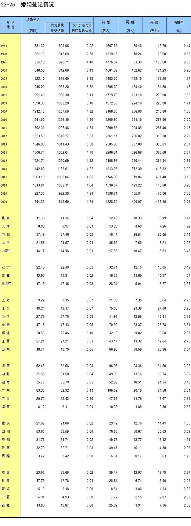 國家統(tǒng)計(jì)局官網(wǎng)近期公布的《中國統(tǒng)計(jì)年鑒2021》已披露了2020年的婚姻登記情況。該統(tǒng)計(jì)年鑒備注信息顯示,包括婚姻登記情況在內(nèi)的社會(huì)服務(wù)統(tǒng)計(jì)資料由民政部和國家醫(yī)療保障局提供。
