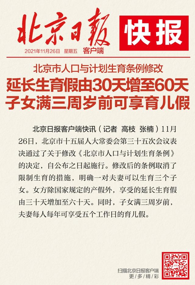 11月26日上午,北京市十五屆人大常委會(huì)第三十五次會(huì)議表決通過(guò)了關(guān)于修改《北京市人口與計(jì)劃生育條例》的決定,自公布之日起施行。修改后的條例取消了限制生育的措施,明確一對(duì)夫妻可以生育三個(gè)子女。女方除國(guó)家規(guī)定的產(chǎn)假外,享受的延長(zhǎng)生育假由三十天增加至六十天。同時(shí),子女滿(mǎn)三周歲前,夫妻每人每年可享受五個(gè)工作日的育兒假。