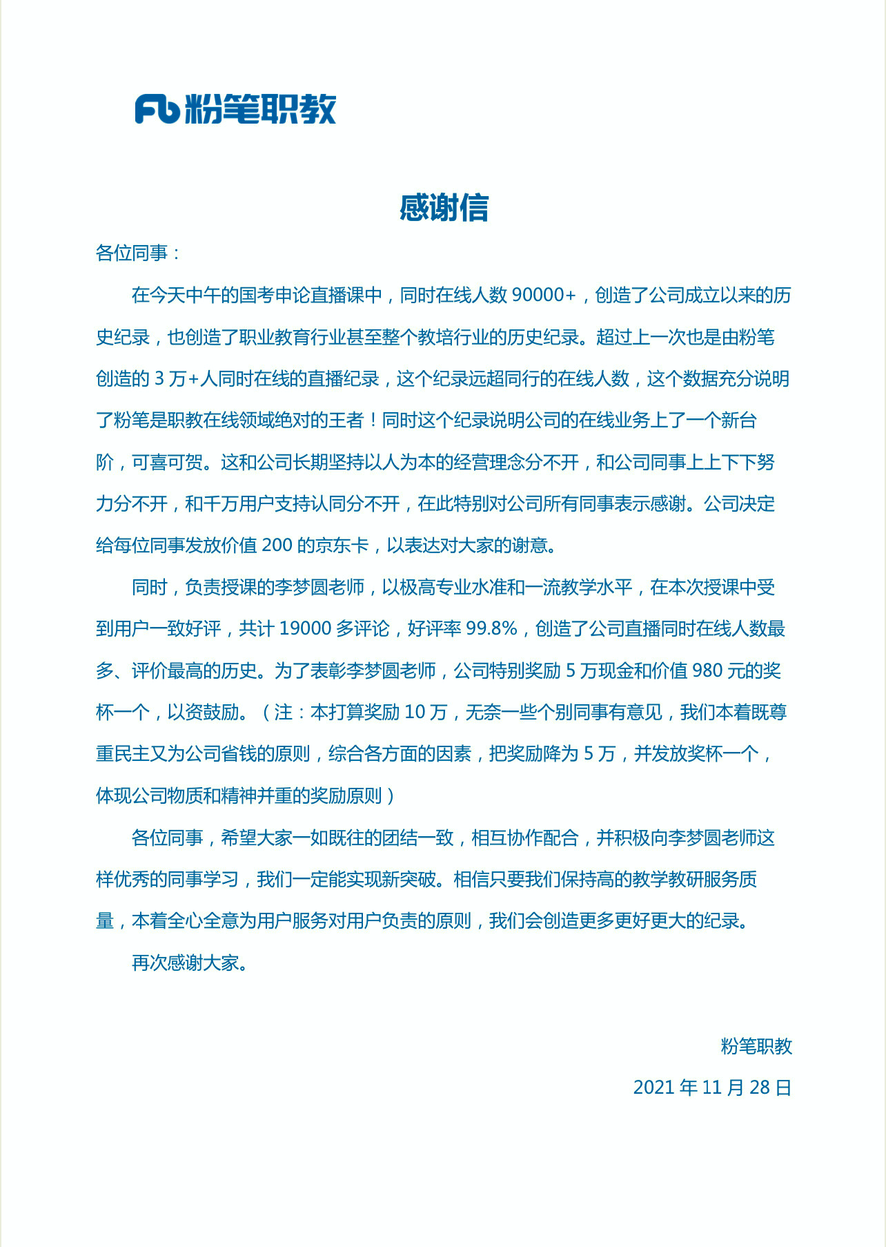 同時(shí),感謝信中還提到,將就此事獎(jiǎng)勵(lì)所有員工200元價(jià)值的京東卡。該場授課負(fù)責(zé)老師為粉筆名師李夢圓,在本場直播中收獲19000多評論,好評率達(dá)99.8%,創(chuàng)造了粉筆直播同時(shí)在線人數(shù)最多、評價(jià)最高的歷史,特別獎(jiǎng)勵(lì)5萬元現(xiàn)金和價(jià)值980元的獎(jiǎng)杯一個(gè)。