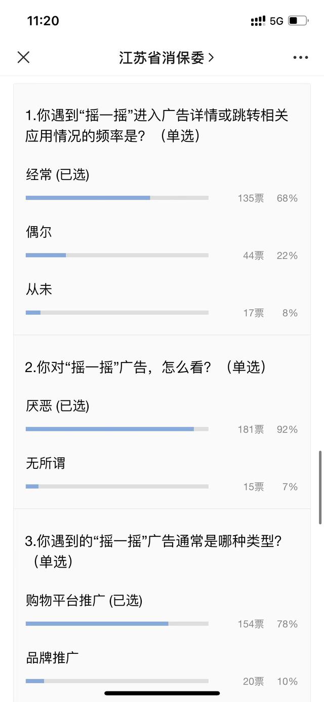 江蘇省消保委官方微信公眾號(hào)組織的投票調(diào)查顯示,有68%的消費(fèi)者經(jīng)常遇到“搖一搖”開屏廣告,92%的消費(fèi)者對(duì)這類廣告感到厭惡。