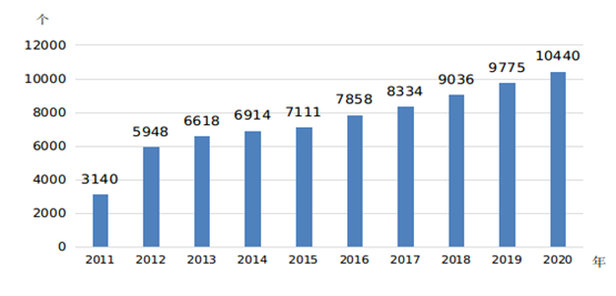 3.殘疾兒童康復(fù)服務(wù)水平顯著提升?!毒V要》實(shí)施以來(lái),國(guó)家先后實(shí)施殘疾兒童搶救性康復(fù)項(xiàng)目、殘疾兒童康復(fù)救助制度,目前全國(guó)殘疾兒童康復(fù)救助政策體系、工作體系和服務(wù)網(wǎng)絡(luò)全面建立,為開(kāi)展殘疾兒童康復(fù)救助提供了有力保障。截至2020年底,全國(guó)開(kāi)展殘疾兒童康復(fù)的殘疾人康復(fù)機(jī)構(gòu)10440個(gè)(見(jiàn)圖6),比2011年增加7300個(gè)。2020年,全國(guó)共有23.7萬(wàn)名0—6歲殘疾兒童接受了基本康復(fù)服務(wù),比2016年[6]增加8.7萬(wàn)人,接受基本康復(fù)服務(wù)的殘疾人中0—6歲殘疾兒童比重為2.2%。