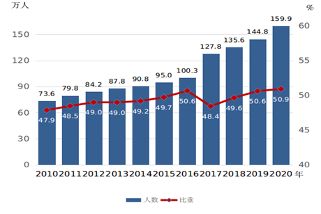 4.各類高等教育中女生占比均超過(guò)男生。《綱要》實(shí)施以來(lái),我國(guó)高等教育得到快速發(fā)展,女性接受高等教育機(jī)會(huì)不斷增加;多渠道、多形式為貧困和殘疾女大學(xué)生提供資助,女性平等接受高等教育得到有力保障。2020年,高等教育毛入學(xué)率為54.4%,比2010年提高27.9個(gè)百分點(diǎn)。高等教育在校生中女研究生人數(shù)為159.9萬(wàn)人,占全部研究生的比重達(dá)到50.9%,比2010年提高3.1個(gè)百分點(diǎn)(見(jiàn)圖4);普通本??啤⒊扇吮緦?圃谛I信謩e為1674.2萬(wàn)人和450.6萬(wàn)人,占比分別為51.0%和58.0%,分別比2010年提高0.1個(gè)和4.9個(gè)百分點(diǎn)。