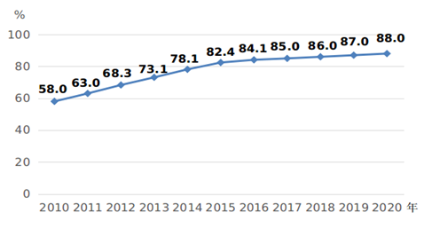 3.農(nóng)村人居環(huán)境持續(xù)改善。2018年,中央農(nóng)辦等18個(gè)部門聯(lián)合印發(fā)《農(nóng)村人居環(huán)境整治村莊清潔行動(dòng)方案》,啟動(dòng)并實(shí)施村莊清潔行動(dòng),目前農(nóng)村人居環(huán)境整治三年行動(dòng)方案目標(biāo)任務(wù)全面完成。全國(guó)95%以上的村莊開(kāi)展了清潔行動(dòng),村民的環(huán)境與健康意識(shí)進(jìn)一步增強(qiáng),村莊環(huán)境趨于干凈整潔。2020年,農(nóng)村集中式供水受益人口比重達(dá)到88.0%,比2010年提高30個(gè)百分點(diǎn),實(shí)現(xiàn)《綱要》“達(dá)到85%左右”的目標(biāo)(見(jiàn)圖8)。