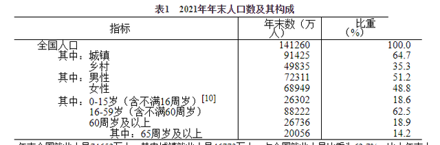 年末全國人口141260萬人,比上年末增加48萬人,其中城鎮(zhèn)常住人口91425萬人。全年出生人口1062萬人,出生率為7.52‰;死亡人口1014萬人,死亡率為7.18‰;自然增長(zhǎng)率為0.34‰。全國人戶分離的人口5.04億人,其中流動(dòng)人口3.85億人。