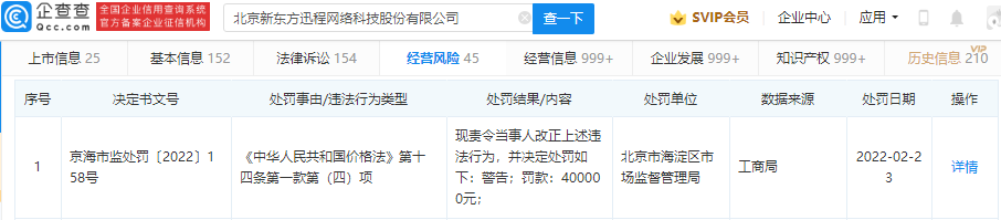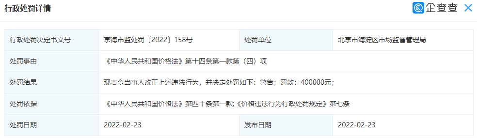 2022-03-01 13:39:54閱讀()互聯(lián)網(wǎng)3月1日消息,信息顯示,近日,北京新東方迅程網(wǎng)絡(luò)科技股份有限公司因涉嫌利用虛假或使人誤解的價(jià)格手段誘騙消費(fèi)者交易,被北京市海淀區(qū)市場(chǎng)監(jiān)督管理局罰款40萬(wàn)元。
