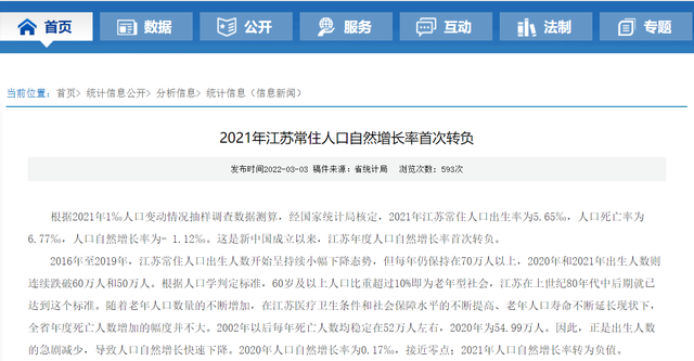 江蘇省統(tǒng)計局網(wǎng)站發(fā)布的《2021年江蘇常住人口自然增長率首次轉(zhuǎn)負(fù)》(下稱“報告”)一文分析指出,根據(jù)2021年1‰人口變動情況抽樣調(diào)查數(shù)據(jù)測算,經(jīng)國家統(tǒng)計局核定,2021年江蘇常住人口出生率為5.65‰,人口死亡率為6.77‰,人口自然增長率為-1.12‰。這是新中國成立以來,江蘇年度人口自然增長率首次轉(zhuǎn)負(fù)。