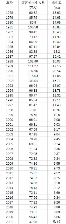 表:1978年以來江蘇歷年出生人口數(shù)據(jù)(數(shù)據(jù)來源:第一財經(jīng)記者根據(jù)《江蘇統(tǒng)計年鑒2021》、2021年江蘇省國民經(jīng)濟和社會發(fā)展統(tǒng)計公報整理)