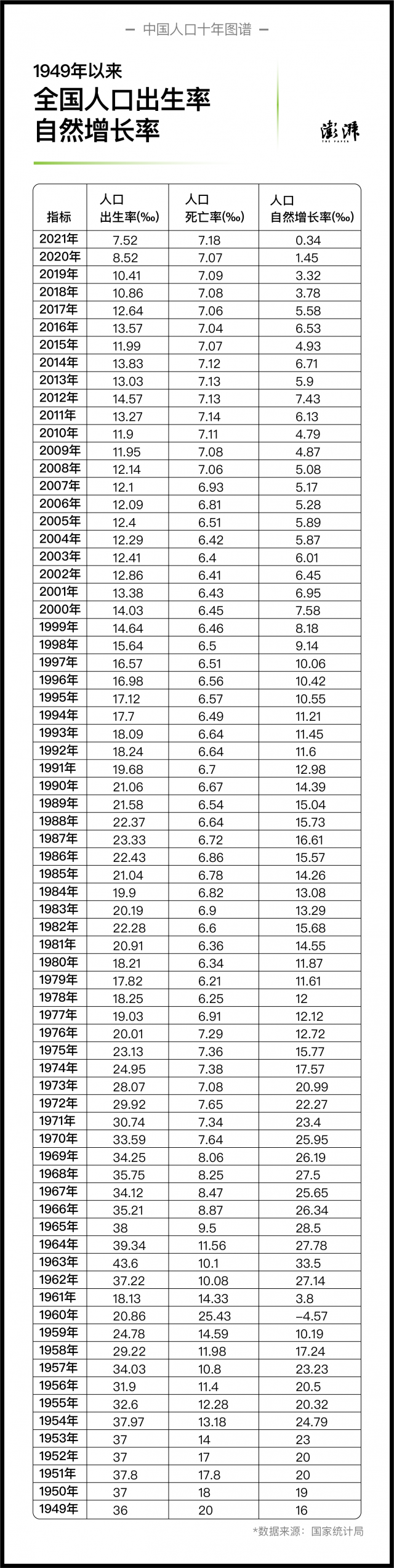 1949年以來(lái)全國(guó)人口出生率、人口自然增長(zhǎng)率 制圖 澎湃新聞 晁嘉笙、彭艷秋