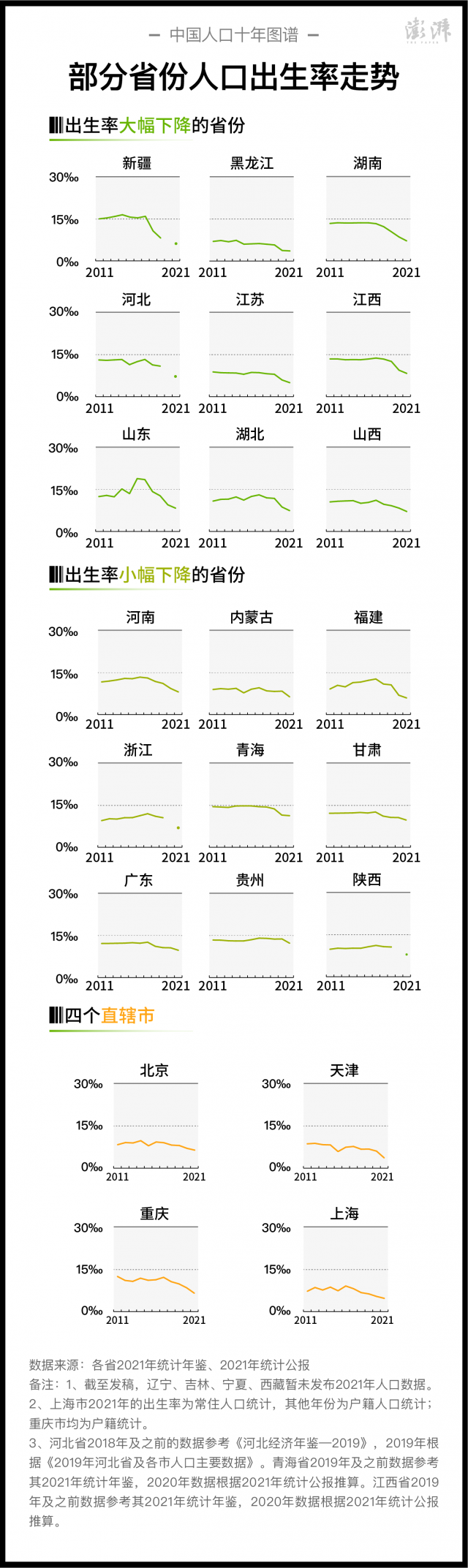 從出生率來(lái)看,已公布的省份中,2021年排在前三的省份為貴州省、青海省、甘肅省,分別為12.17‰、11.22‰、9.68‰;黑龍江省、上海市、江蘇省,為公布省份中2021年生育率最低的三省市,分別為3.59‰、4.67‰、5.7‰。2011年,出生率排在前三的省區(qū)為西藏、新疆、青海(注:海南由于統(tǒng)計(jì)年鑒未公布這一年的出生率未計(jì)入),分別為15.39‰、14.99‰、14.43‰。