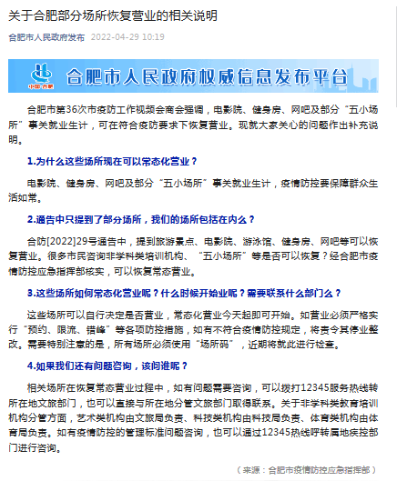 2022-04-29 23:06:18閱讀()合肥市人民政府據(jù)合肥市人民政府發(fā)布微信號(hào)消息,合肥市第36次市疫防工作視頻會(huì)商會(huì)強(qiáng)調(diào),電影院、健身房、網(wǎng)吧及部分“五小場(chǎng)所”事關(guān)就業(yè)生計(jì),可在符合疫防要求下恢復(fù)營(yíng)業(yè)。合肥市疫情防控應(yīng)急指揮部現(xiàn)就大家關(guān)心的問(wèn)題作出補(bǔ)充說(shuō)明。