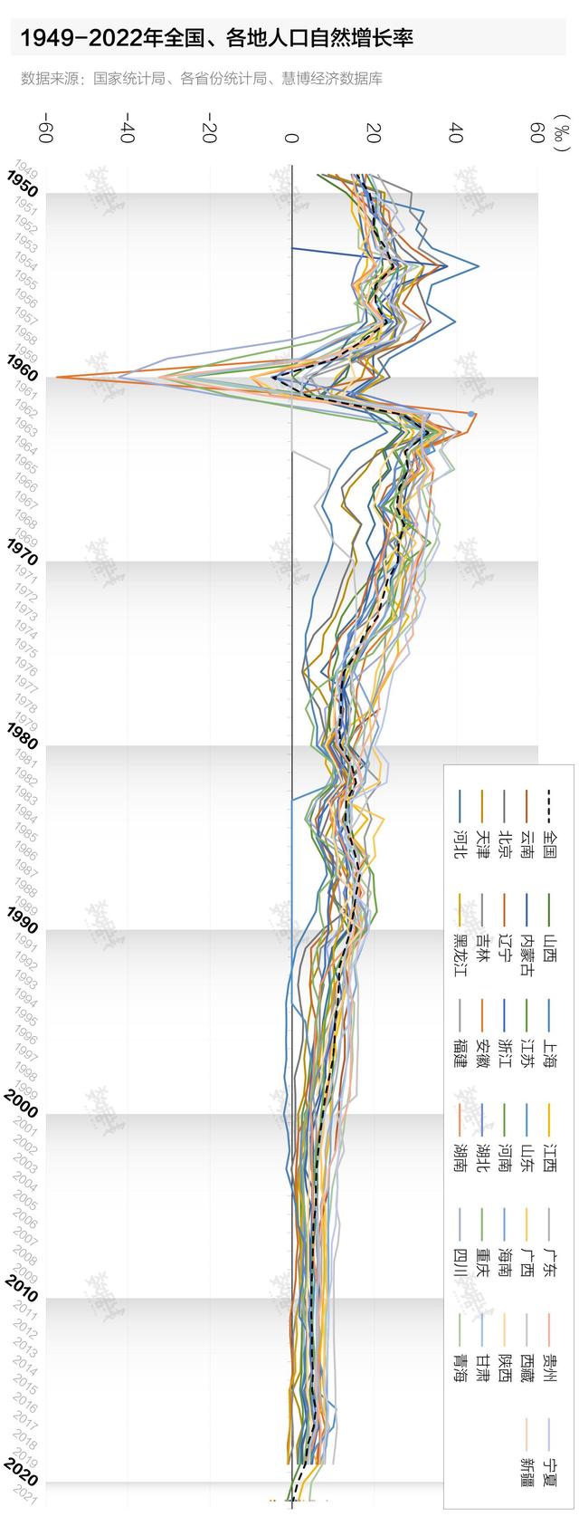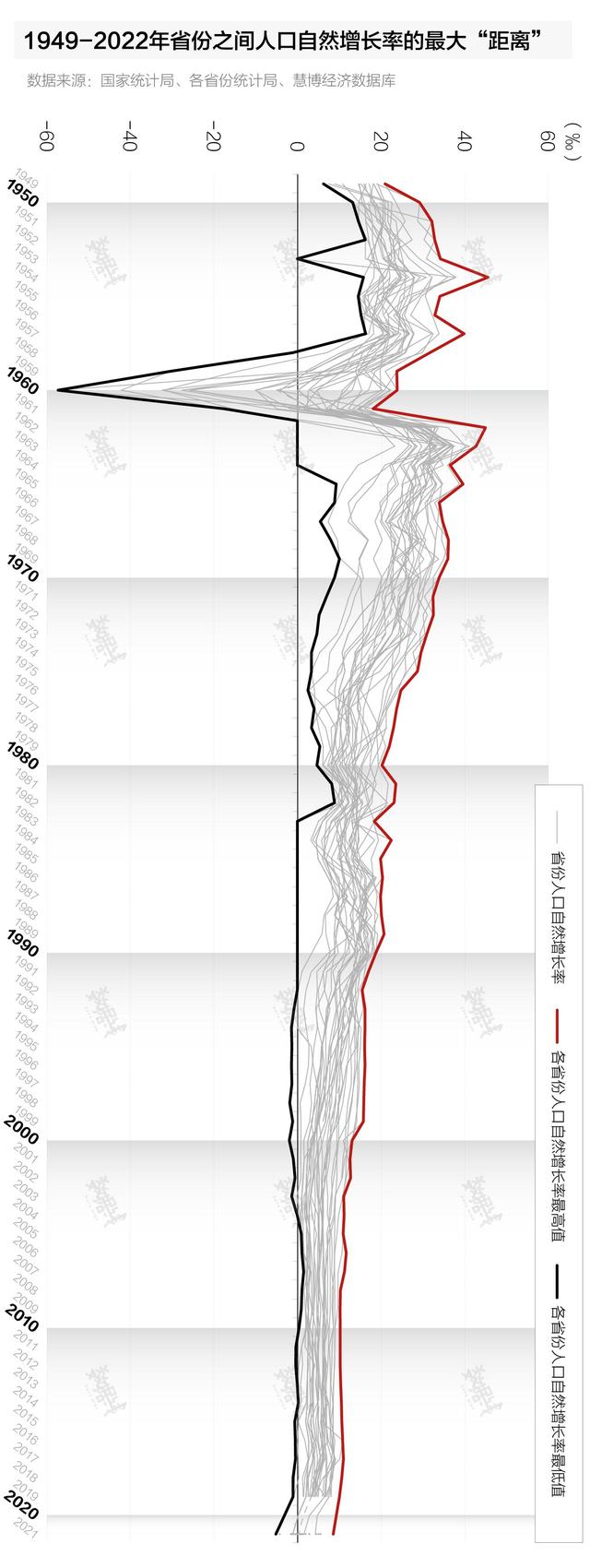 界面數(shù)據(jù)進(jìn)一步統(tǒng)計(jì)后發(fā)現(xiàn),1960年以來,各省份之間人口自然增長(zhǎng)率的跌勢(shì)在趨緩、“差距”在縮小。