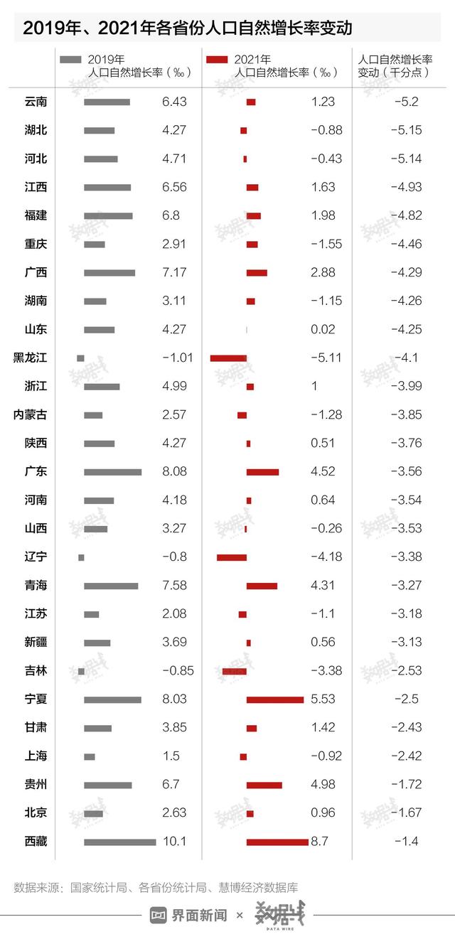 分各省份來看,據(jù)界面數(shù)據(jù)測(cè)算,在有人口自然增長(zhǎng)率可查的27個(gè)省份中,以2019年數(shù)據(jù)為基準(zhǔn)線(2020年僅3個(gè)省份公布了人口自然率數(shù)據(jù)),2021年,人口自然增長(zhǎng)率下降最大的3個(gè)省份是云南、湖北、河北,跌幅超5個(gè)千分點(diǎn)。