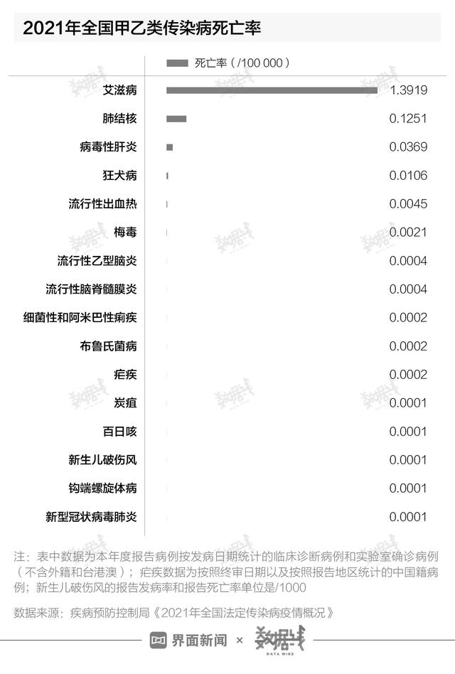 與其他傳染病相比,0.0001/10萬的死亡率處在何種水平?2021年,全國(guó)法定傳染病的死亡率為1.81/10萬。在16種有死亡率公布的甲乙類傳染病中,死亡率為0.0001/10萬的新冠肺炎,與炭疽、百日咳等4類傳染病并列倒數(shù)第一。排在首位的的艾滋病,死亡率為1.3919/10萬。