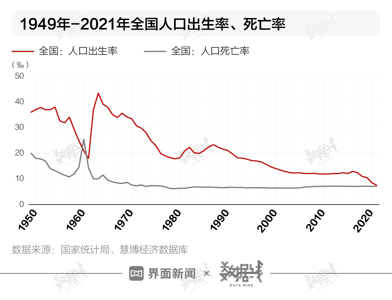 那么,到底問題出在哪?界面數(shù)據(jù)在統(tǒng)計(jì)了歷年人口出生率、死亡率數(shù)據(jù)后發(fā)現(xiàn),人口增長(zhǎng)率大幅下跌,“主要問題”在出生人口上。