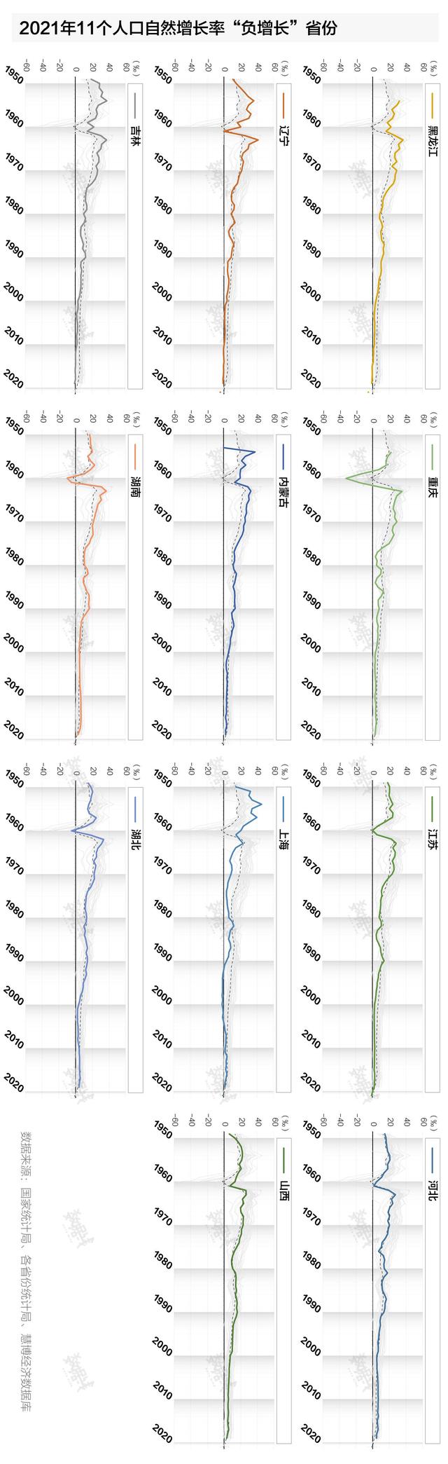 截至2021年,全國(guó)多省份已開啟人口“負(fù)增長(zhǎng)”。據(jù)界面數(shù)據(jù)統(tǒng)計(jì),在有人口自然增長(zhǎng)率數(shù)據(jù)公布的27個(gè)省份中,11省份人口自然增長(zhǎng)率已為負(fù)值,占到近4成。其中,東北地區(qū)黑龍江、遼寧人口自然增長(zhǎng)率“最嚴(yán)重”,分別為-5.11‰、-4.18‰。其次是重慶、內(nèi)蒙古,分別為-1.55‰和-1.28‰。