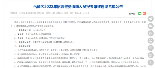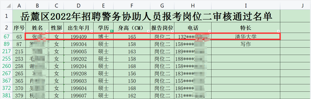 據(jù)長(zhǎng)沙市岳麓區(qū)于5月21日中午12點(diǎn)公布的《岳麓區(qū)2022年招聘警務(wù)協(xié)助人員報(bào)考審核通過(guò)名單公告》顯示,在通過(guò)“警務(wù)協(xié)助人員崗位二”審核的人員表格中,出現(xiàn)了眾多本科碩士人員,其中最高學(xué)歷為一位1994年出生的張姓女博士(特長(zhǎng)備注為“清華大學(xué)”),另有研究生10人,本科349人。公告顯示,名單中人員已完成警務(wù)協(xié)助人員報(bào)名和資格審查,將按照要求參加體能測(cè)試。不過(guò),據(jù)@九派新聞報(bào)道,23日,岳麓區(qū)相關(guān)人員表示,該張姓博士系在校生,不符合招聘條件,因此遺憾未被錄取。