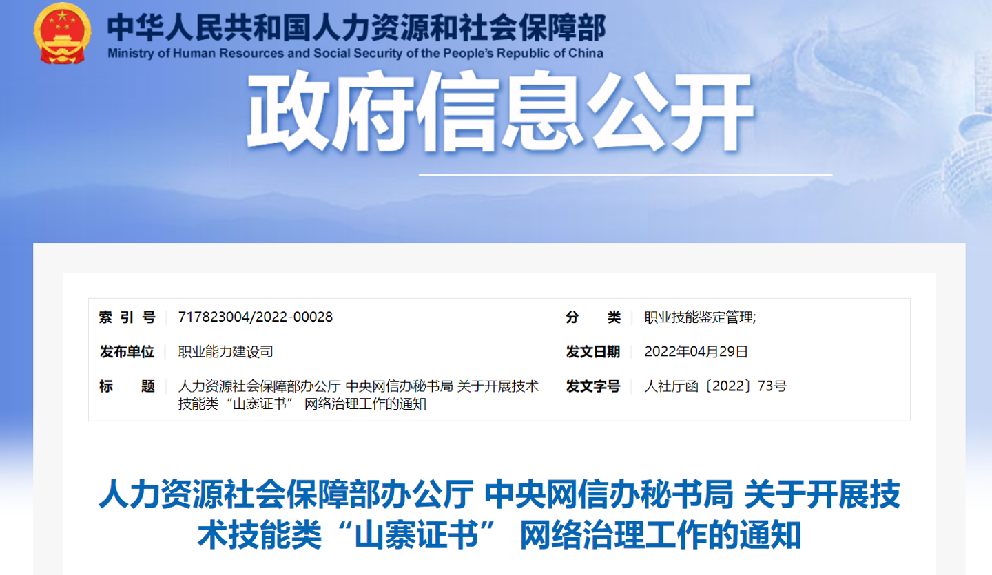 今年3月,人社部、中央網(wǎng)信辦印發(fā)了《關于開展技術技能類“山寨證書”專項治理工作的通知》,對技術技能類“山寨證書”進行網(wǎng)絡治理。