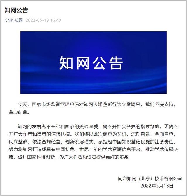 5月13日時,同方知網(wǎng)(北京)技術(shù)有限公司曾發(fā)布公告稱,堅決支持,全力配合國家市場監(jiān)督管理總局對知網(wǎng)涉嫌壟斷行為立案調(diào)查。