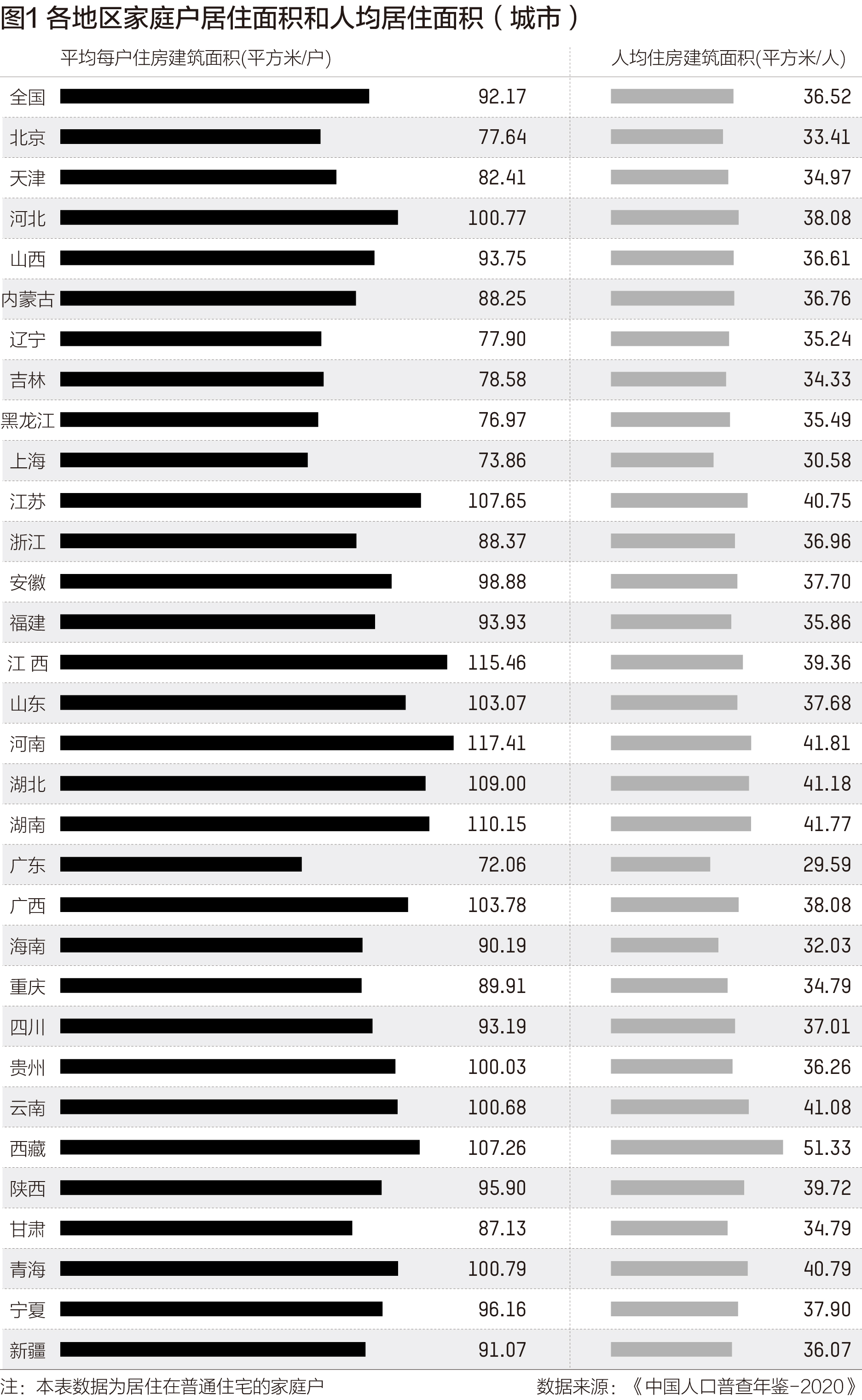 由于各個(gè)地區(qū)家庭結(jié)構(gòu)的差異,戶均人數(shù)也存在較大差異。因此,各地的城市人均居住面積數(shù)據(jù)更能直接反映各地居民的居住情況。數(shù)據(jù)顯示,2020年我國城市人均住房建筑面積為36.52平方米。