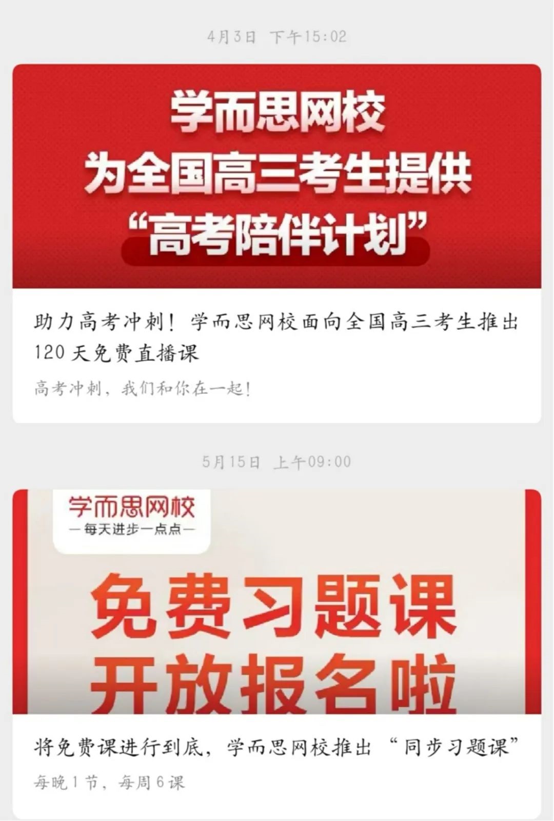 記者注意到,學(xué)而思網(wǎng)校在 4 月 3 日通過官方微信宣布面向高三學(xué)生推出 120 天免費直播課。緊接著,5 月 15 日又再次宣布 “將免費課進行到底”,每周一到周六每天晚上開設(shè) 40 分鐘的同步習(xí)題課,覆蓋小學(xué)一年級到初中三年級。
