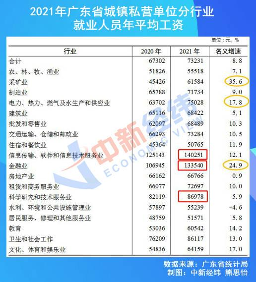 以廣東省為例,分行業(yè)門類看,年平均工資最高的分別是信息傳輸、軟件和信息技術(shù)服務(wù)業(yè)140251元,金融業(yè)133540元,科學研究和技術(shù)服務(wù)業(yè)86978元;從增長速度看,年平均工資增速最高的三個行業(yè)門類依次為采礦業(yè),金融業(yè)和電力、熱力、燃氣及水生產(chǎn)和供應(yīng)業(yè),分別增長35.6%、24.9%和17.8%。