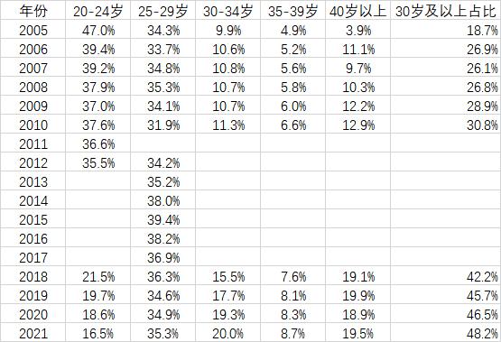 總體看,30-34歲和35-39歲這兩個年齡段的占比都創(chuàng)下了近年來的新高。若以30歲為界來看,30歲以及以上人群占比合計達(dá)到了48.2%,比上一年度提高了1.7個百分點,創(chuàng)下了新高。整體而言,我國結(jié)婚年齡越來越遲。
