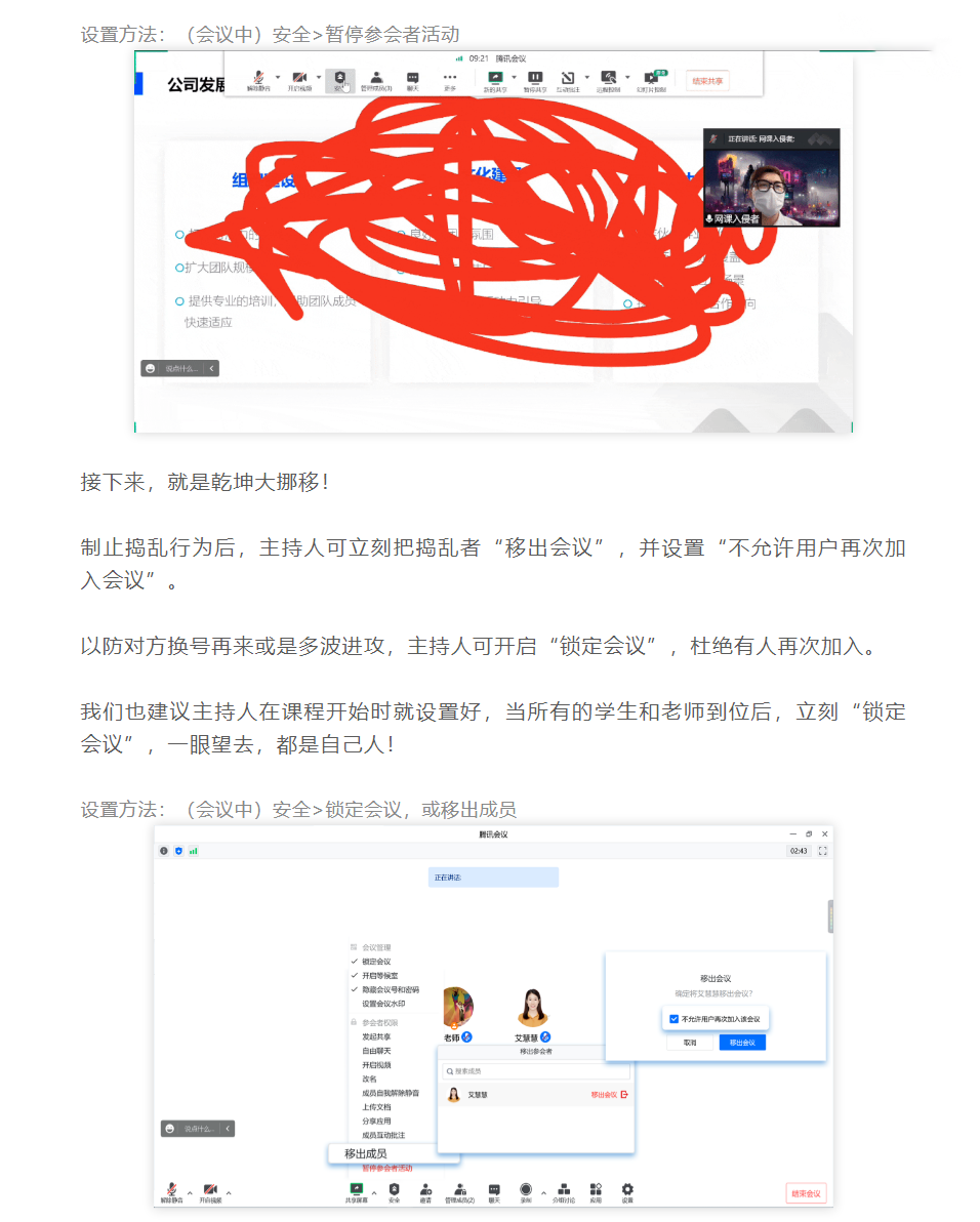 設(shè)置方法:(會議中)安全 > 暫停參會者活動。制止搗亂行為后,主持人可立刻把搗亂者“移出會議”,并設(shè)置“不允許用戶再次加入會議”。建議主持人在課程開始時就設(shè)置好,當所有的學(xué)生和老師到位后,立刻“鎖定會議”。