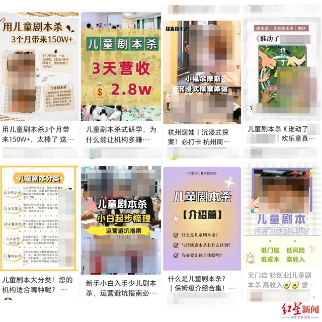 值得注意的是,大部分內容都在強調兒童劇本殺輕資產(chǎn)、低門檻、收入高,不僅可以作為教培機構的消課方式,也可以作為線下兒童書店增強顧客體驗的手段。“目前是藍海市場,關于兒童劇本殺的市場競爭較緩……全新的兒童文化娛樂賽道將打開兒童教學娛樂的新局面。”某兒童劇本殺品牌在視頻中介紹。