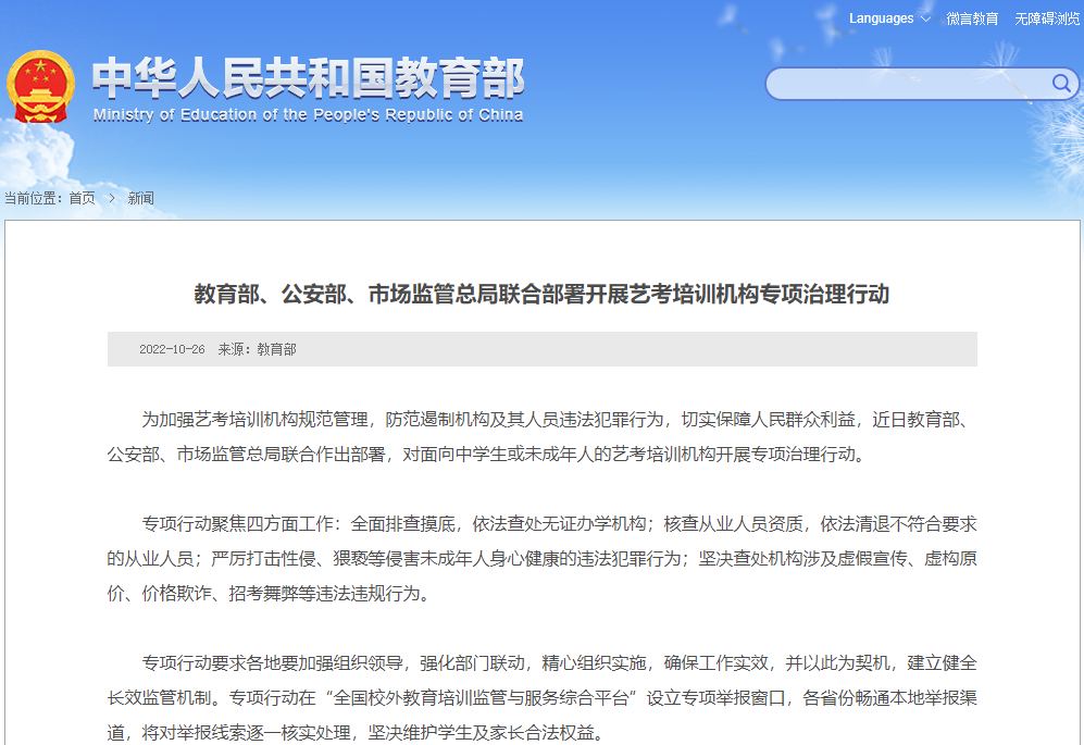 2022-10-27 09:43:03閱讀()央廣網(wǎng)10月26日,據(jù)教育部了解到,為加強(qiáng)藝考培訓(xùn)機(jī)構(gòu)規(guī)范管理,防范遏制機(jī)構(gòu)及其人員違法犯罪行為,切實保障人民群眾利益,近日教育部、公安部、市場監(jiān)管總局聯(lián)合作出部署,對面向中學(xué)生或未成年人的藝考培訓(xùn)機(jī)構(gòu)開展專項治理行動。
