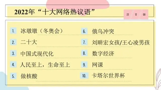 入選2022年“十大網(wǎng)絡熱議語”的有:“冰墩墩(冬奧會)”“二十大”“中國式現(xiàn)代化”“人民至上,生命至上”“做核酸”“俄烏沖突”“劉畊宏女孩/王心凌男孩”“數(shù)字經(jīng)濟”“網(wǎng)課”“卡塔爾世界杯”。