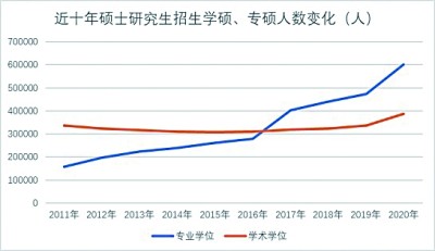 在相關政策的推動下,碩士研究生招生總人數(shù)中,專碩招生人數(shù)增長明顯。2017年起,專碩招生人數(shù)突破40萬,首次超過學碩招生人數(shù)。到2020年專碩招生人數(shù)超過60萬人,并與學碩招生人數(shù)之間差距逐漸拉大。