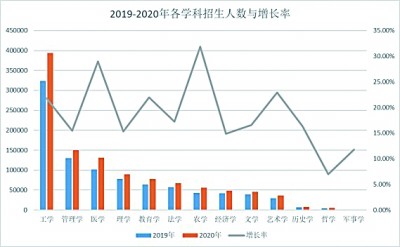 2020年研究生招生總量較上一年增長20.73%。從各學科增長率方面看,農(nóng)學是增長率最高的學科,達到了31.85%。其次是醫(yī)學,招生人數(shù)增長率達到了29%。