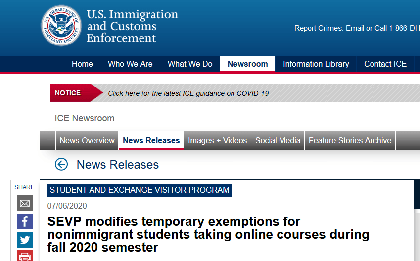 本月6日,ICE出臺新規(guī)稱,如果所在大學(xué)2020年秋季學(xué)期采取全面網(wǎng)上授課,這些學(xué)校的所有國際學(xué)生將不會(huì)獲得赴美簽證,已在美國境內(nèi)者需離境。