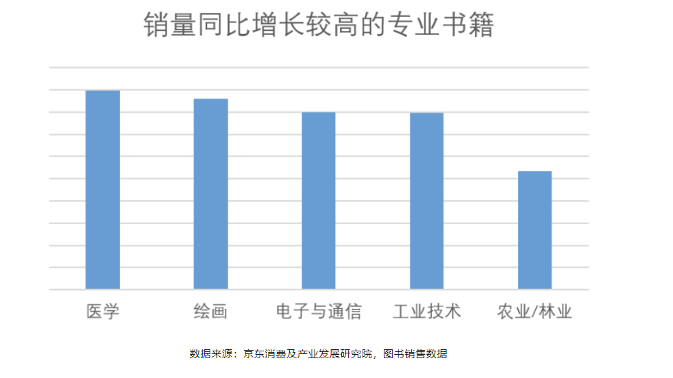 2023年網(wǎng)上銷售的專業(yè)書籍中,醫(yī)學(xué)、繪畫、電子與通信、工業(yè)技術(shù)和農(nóng)業(yè)/林業(yè)書籍的銷量增長(zhǎng)最高。