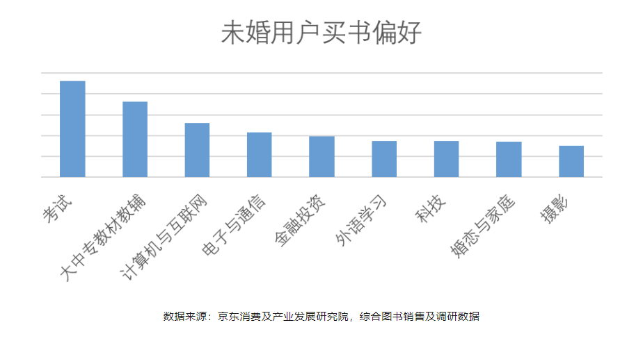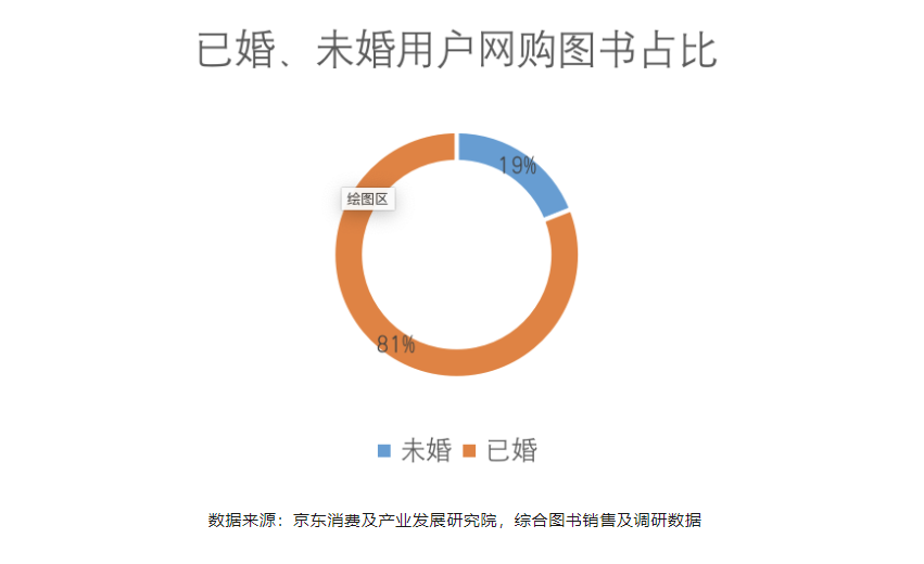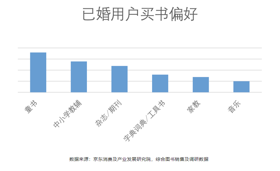 已婚用戶的書籍購(gòu)買量是未婚用戶的4倍,買走了8成以上的圖書。從品類偏好來(lái)看,未婚用戶網(wǎng)購(gòu)考試、教輔書、計(jì)算機(jī)等專業(yè)書的占比高于整體,讀書主要是為了拼事業(yè)和前程。然而在結(jié)婚后買書的重心改變了,已婚用戶在童書、中小學(xué)教輔、家教等品類的消費(fèi)占比高于整體,教育下一代成為網(wǎng)購(gòu)圖書的第一出發(fā)點(diǎn)。
