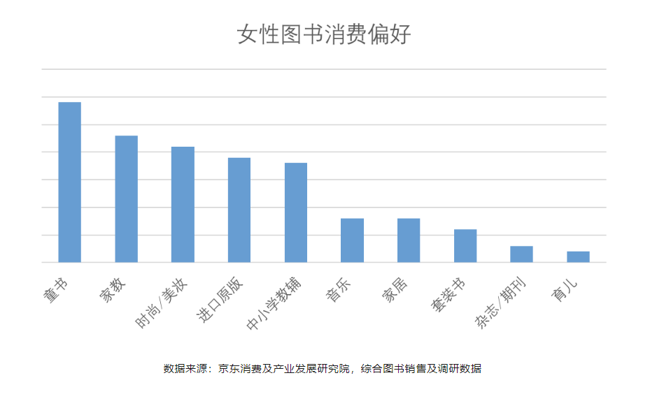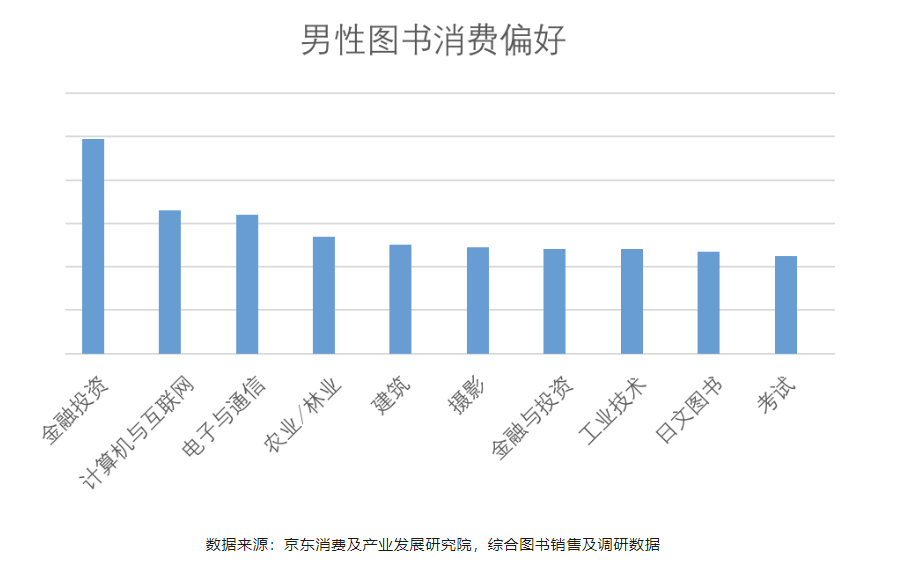 男性消費(fèi)者對(duì)金融投資、計(jì)算機(jī)與互聯(lián)網(wǎng)等領(lǐng)域更感興趣,閱讀興趣比較偏向?qū)I(yè)領(lǐng)域的知識(shí)類書籍。而女性則更喜歡購(gòu)買與家庭教育和藝術(shù)相關(guān)的圖書,在童書、家教及時(shí)尚、音樂(lè)類圖書的消費(fèi)偏好較高。