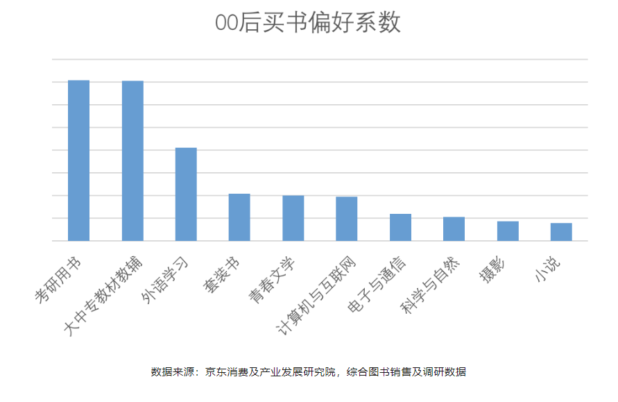 從00后的網(wǎng)購(gòu)圖書偏好來(lái)看,00后讀書的主要壓力在于考研。他們?cè)诳佳杏脮?、大中專教材教輔、外語(yǔ)學(xué)習(xí)類圖書的消費(fèi)偏好最高,同時(shí)也愛(ài)買青春文學(xué)、攝影圖書和小說(shuō)。