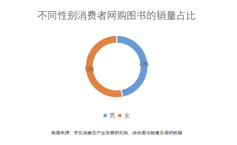 從報(bào)告中獲悉,京東的銷售情況顯示,女性網(wǎng)購(gòu)圖書的銷量占比53%,高于男性6個(gè)百分點(diǎn)。
