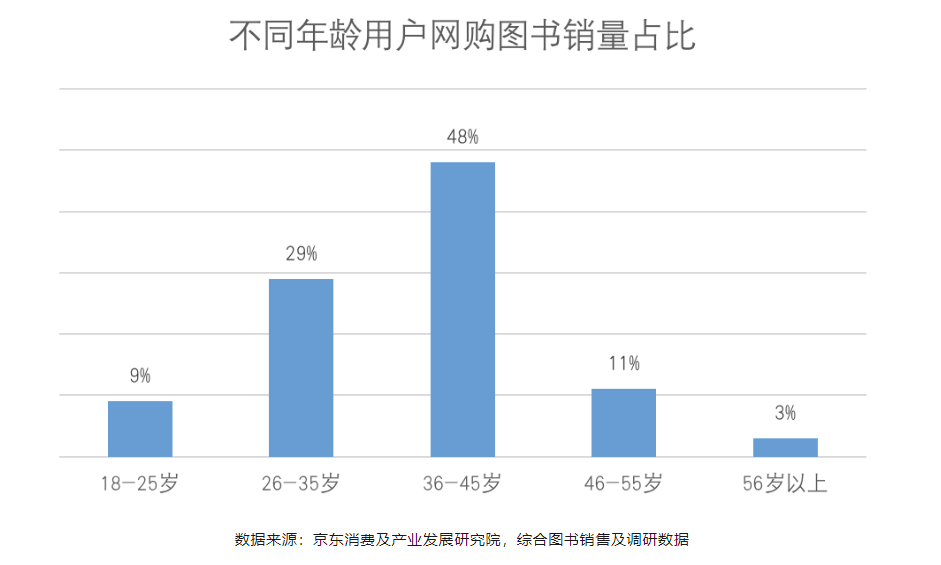 從購(gòu)買力的角度看,36-45歲消費(fèi)者買走了近5成圖書,26-35歲消費(fèi)者買走了近3成圖書。