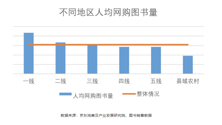 不同地區(qū)網(wǎng)購(gòu)圖書的表現(xiàn)存在明顯的差異。一線城市人均網(wǎng)購(gòu)圖書量高于全國(guó)均值8.8%,二線城市人均網(wǎng)購(gòu)圖書量高于全國(guó)均值1.6%,三至五線城市網(wǎng)購(gòu)圖書量略低于全國(guó)均值,縣域農(nóng)村人均網(wǎng)購(gòu)圖書量低于全國(guó)均值8.8%。