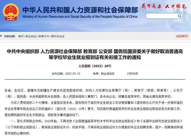 2023-05-13 09:47:19閱讀()人民政協(xié)網(wǎng)據(jù)人社部網(wǎng)站消息,日前中共中央組織部、人力資源社會保障部、教育部、公安部、國務(wù)院國資委發(fā)布《關(guān)于做好取消普通高等學校畢業(yè)生就業(yè)報到證有關(guān)銜接工作的通知》(以下簡稱《通知》)?!锻ㄖ访鞔_,2023年起,不再發(fā)放《全國普通高等學校本??飘厴I(yè)生就業(yè)報到證》和《全國畢業(yè)研究生就業(yè)報到證》(以下統(tǒng)稱“就業(yè)報到證”),取消就業(yè)報到證補辦、改派手續(xù),不再將就業(yè)報到證作為辦理高校畢業(yè)生招聘錄用、落戶、檔案接收轉(zhuǎn)遞等手續(xù)的必需材料。