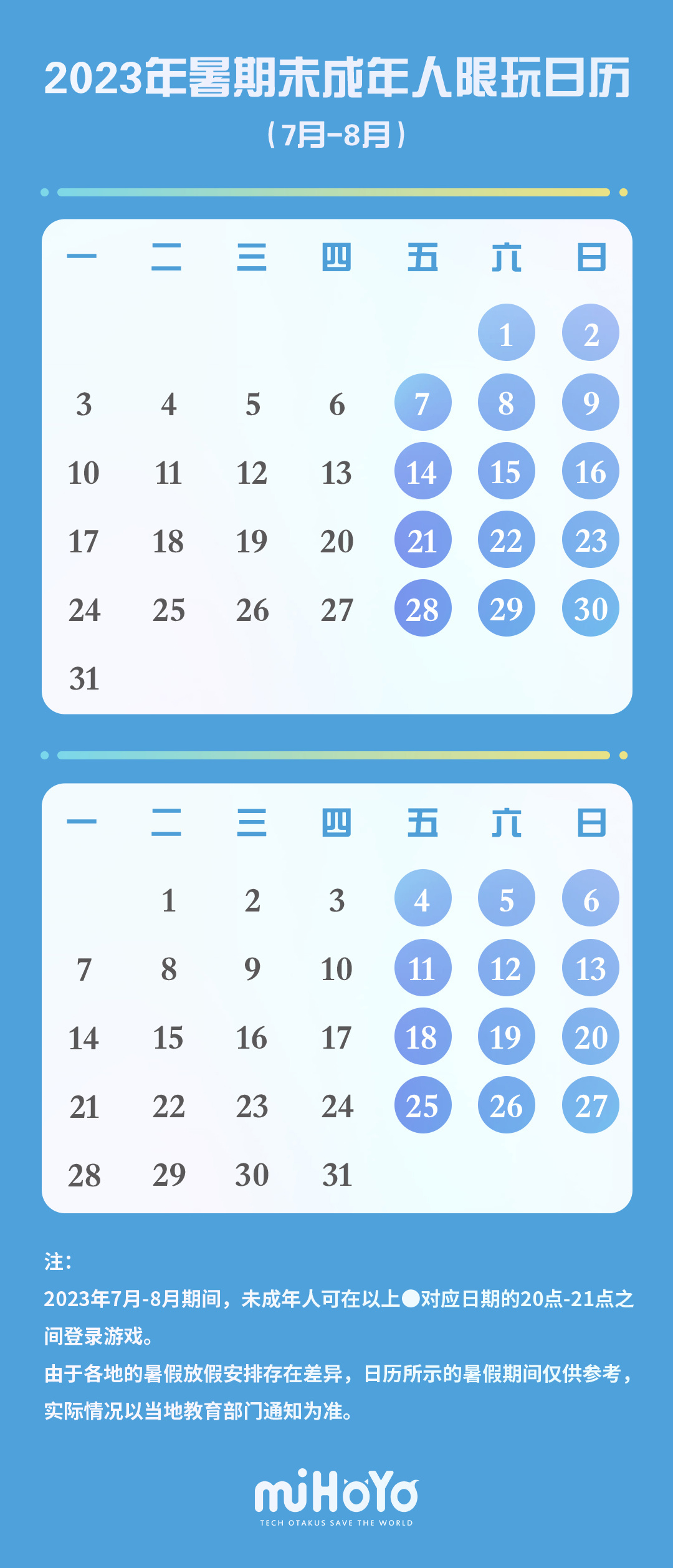 2023-06-29 15:03:05閱讀()互聯(lián)網(wǎng)6月29日消息,騰訊、網(wǎng)易、米哈游今日發(fā)布2023年暑假未成年人限玩通知,未成年人暑假每周僅能周五六日20時(shí)至21時(shí)之間限玩游戲1小時(shí),其余均為禁玩時(shí)段。