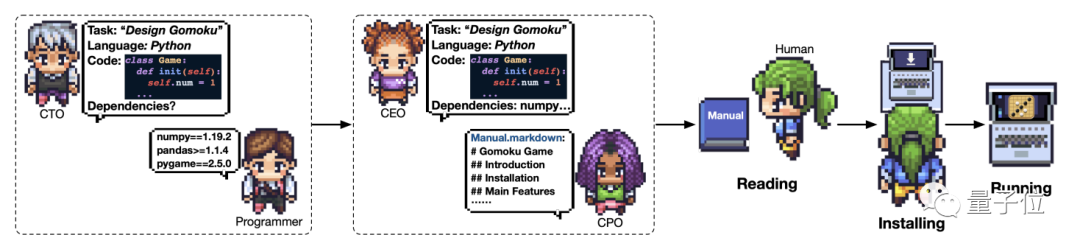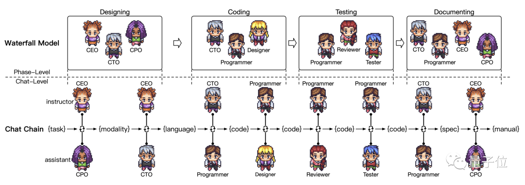 在「公司」中,十多個(gè)聊天機(jī)器人分別扮演著不同的角色,串聯(lián)在一起完成開發(fā)工作。