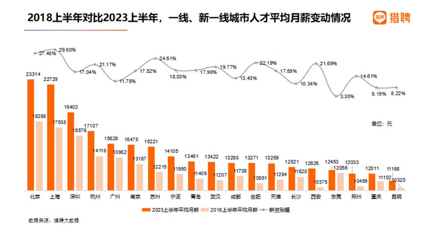 2023-07-25 17:55:34閱讀()中新經(jīng)緯7月25日電 日前,同道獵聘旗下獵聘發(fā)布《2023上半年人才流動(dòng)與薪酬趨勢(shì)報(bào)告》,報(bào)告顯示,從2023年上半年趨勢(shì)來看,越來越多的年輕人正涌向新一線城市。2023年人才投遞熱門城市前三分別為上海、北京和深圳。薪資方面,北京平均月薪18976元全國(guó)最高,而上海近六年來薪資漲幅最高,達(dá)29.6%。