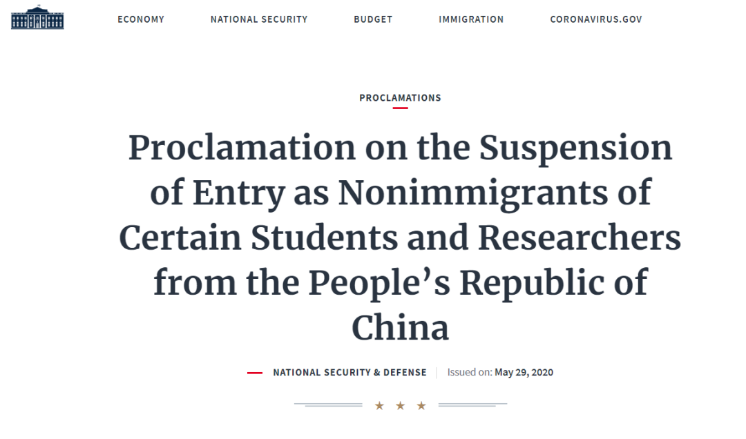 最后值得一提的是,在今年5月29日,美國總統特朗普曾簽發(fā)了一則封殺部分中國留學生和學者的總統令,禁止任何與在中國從事“軍民融合”項目的院校機構有關聯的學生和學者,來美國進行本科以上的學習和學術研究。